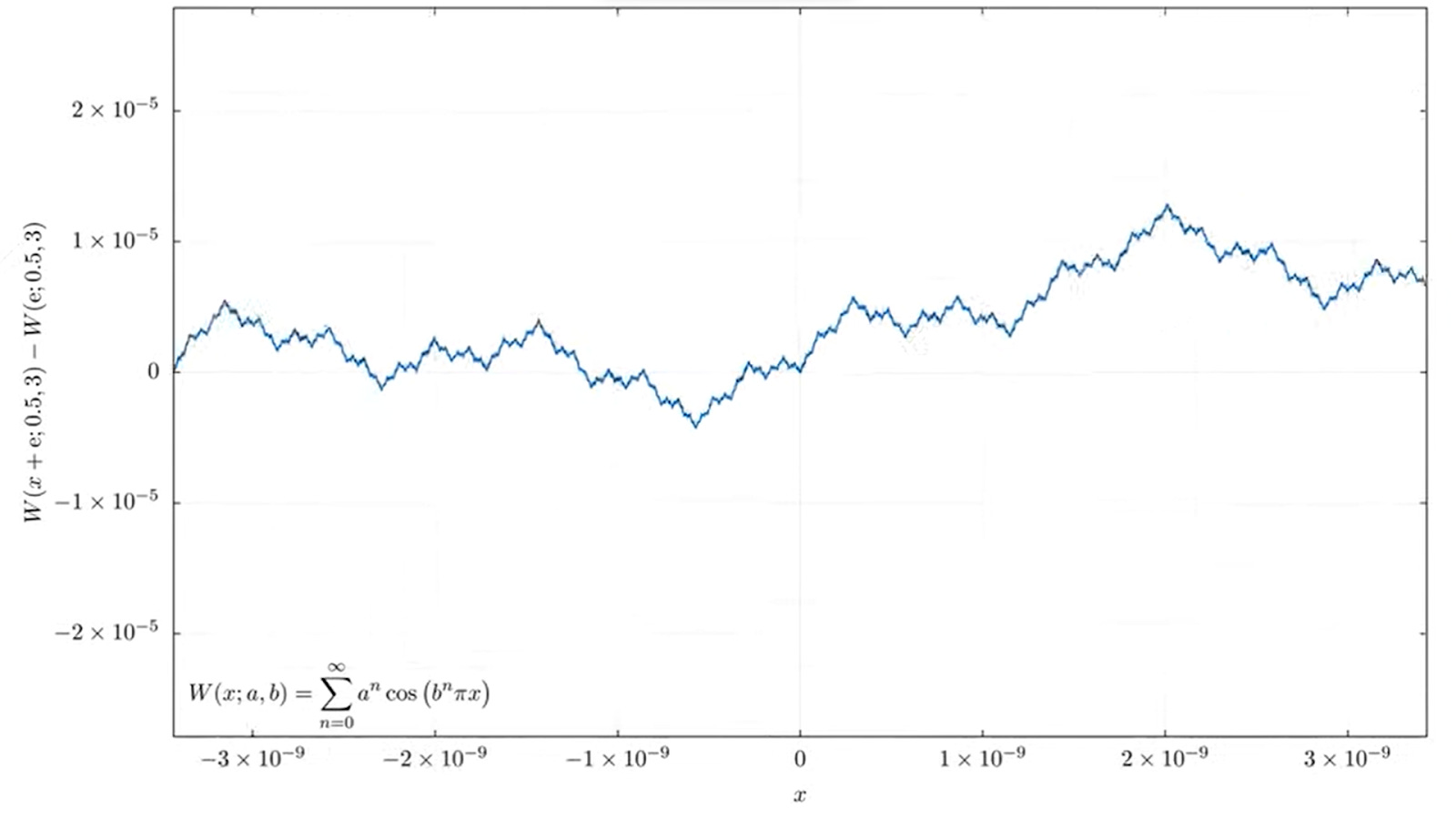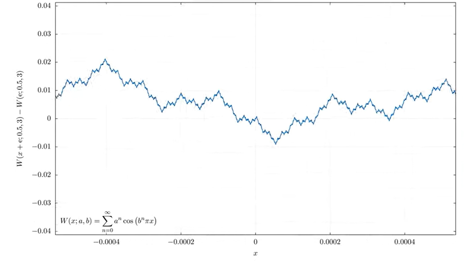 The function at a point is defined as the value which the infinite sum approaches… Some striking characteristics to look at is as n tends to infinity, the frequency of our cos function tends to infinity as well which is similar to our initial approach, but here the first term a^n tends to 0 (as 0<a<1) which in a way tames our infinity that is the limiting value exists . Also here our waves consist of cosine waves which are not straight lines, this is taken care of by a infinite sum which defines a fractal pattern consisting of straight lines, this is similar to a fourier series but is a bit different ( the frequency terms increases exponentially). These are crude but simplified arguments, resources for a more rigorous proof is provided in the Description.